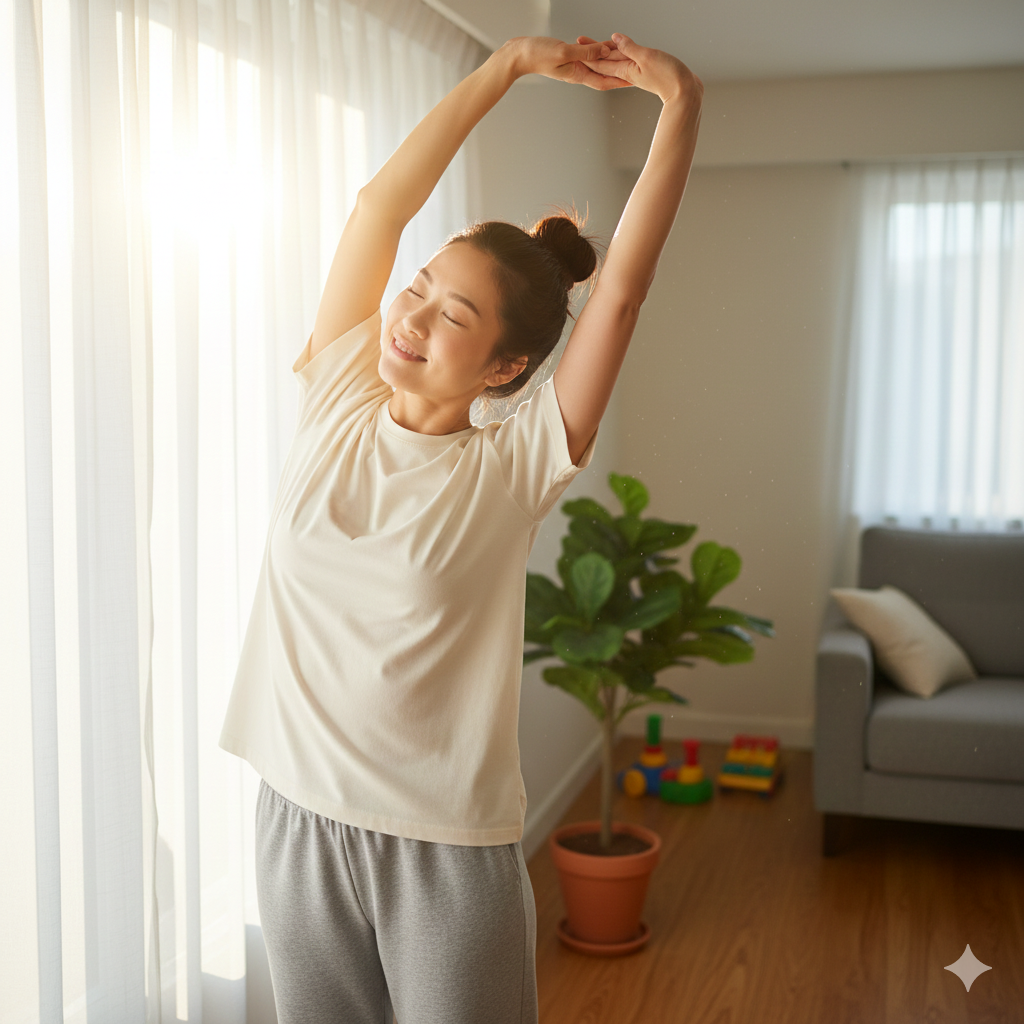 - 方法:腕を組み、頭の上でぐーっと大きく背伸びをします。そのまま、息を「ふぅー」と長く吐きながら、身体を左右にゆっくり傾けます。身体を伸ばすことよりも、息を吐き切ることに集中しましょう。